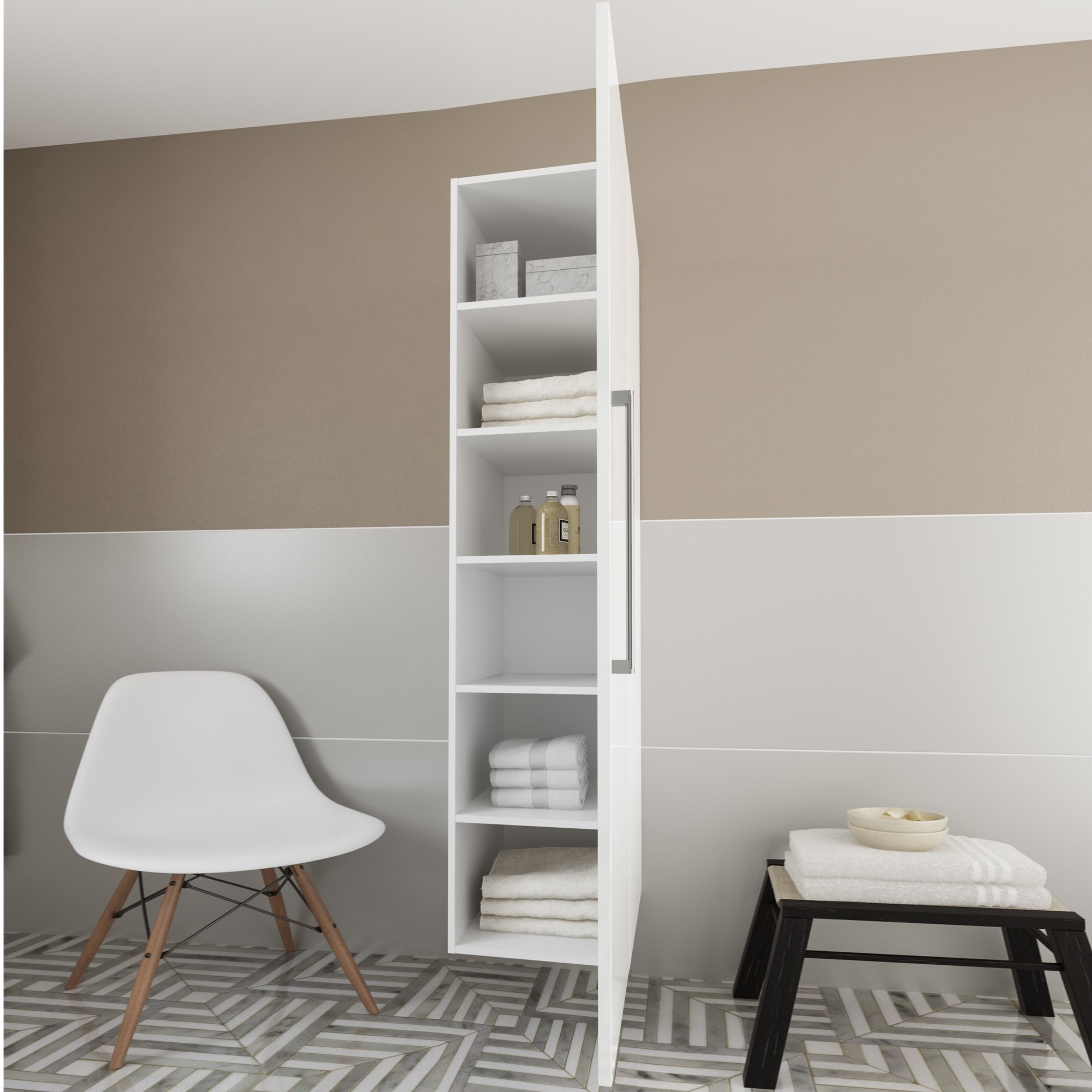 Bak døren der inne er det plass til et garderobeskap med en dybde på maks cm. Møbelet monteres enkelt på vegg, med medfølgende festebeslag. Den praktiske silhuetten er den ideelle lagringsløsningen på et bad, med justerbare hyller og innmat som kan endres etter behov. 40 x 172,8 x 32 cm. Rydd unna rotet med et praktisk høyskap til bad.